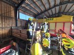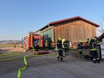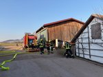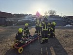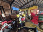 Auf einem landwirtschaftlichen Betrieb galten zwei Personen in einer stark verrauchten Halle als vermisst. Trupps unter schwerem Atemschutz machten sich sofort auf die Suche. Nach dem Auffinden der Personen wurde die Rettung mithilfe von Hebekissen durchgeführt. Parallel dazu musste eine Zubringerleitung vom Hydranten aufgebaut werden, um die Wasserversorgung sicherzustellen.