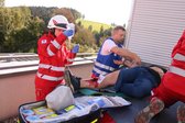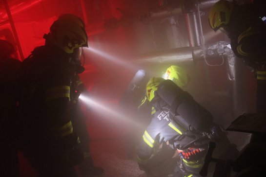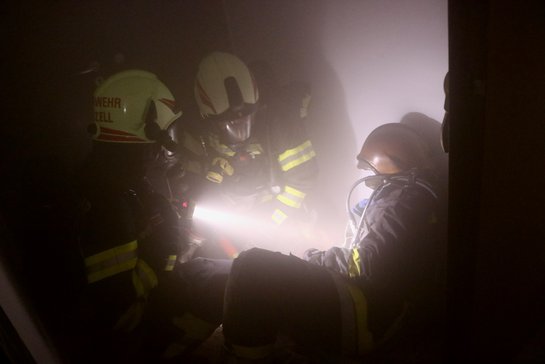 Die Übungsannahme: Eine Verpuffung im Heizungskeller mit mehreren vermissten Personen. Rasch drangen die Atemschutztrupps zur Menschenrettung in das Gebäude vor. Besonders herausfordernd war die Rettung einer schwer verletzten Person von der Dachterrasse, die mithilfe der Teleskopmastbühne bewerkstelligt wurde.