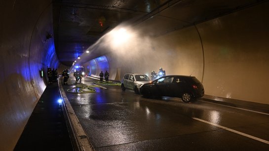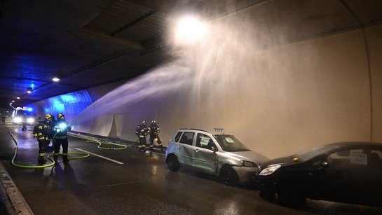 Das Highlight des Tages war ein einsatzrealistischer Löschangriff auf ein inszeniertes PKW-Brand-Szenario im Tunnel. Dabei wurde die gesamte Kette eines realen Brandereignisses durchgespielt: von der Strukturkühlung über die eigentliche Brandbekämpfung bis hin zur Wasserversorgung durch eine Zubringerleitung vom Hydranten im Tunnel.