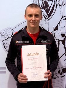 Bei einem Besuch auf dem Bauernhof seiner Großeltern bemerkte Tobias einen Entstehungsbrand im Hackschnitzellager hinter dem Wirtschaftsgebäude. Ohne zu zögern reagierte er richtig: Er alarmierte die Einsatzkräfte über den Feuerwehrnotruf 122 und konnte den Brand noch vor dem Eintreffen der Feuerwehr eigenständig unter Kontrolle bringen.