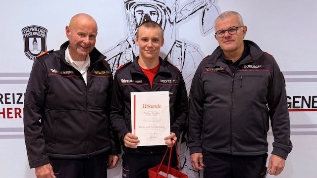 Als Zeichen der Wertschätzung besuchten Bezirksfeuerwehrkommandant Thomas Wurmtödter und Abschnittsfeuerwehrkommandant Harald Dobusch Tobias im Feuerwehrhaus Hagenberg. Sie überreichten ihm eine Urkunde sowie ein kleines Geschenk und bedankten sich persönlich für seine außergewöhnliche Reaktion und seinen Einsatzwillen. Auch Feuerwehrpräsident Robert Mayer ließ seine herzlichen Grüße übermitteln.